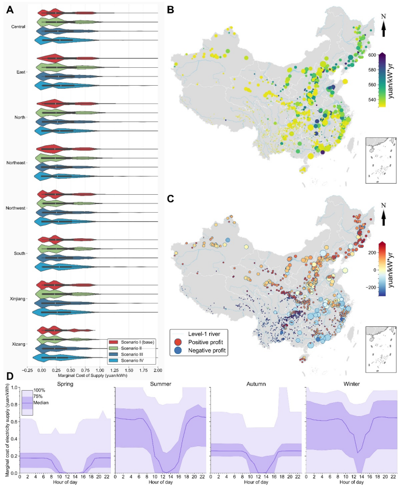 图4. 电力供应边际成本与抽水蓄能经济性分析。(A: 各电网区域边际成本分布;B: 现行补贴机制下闭环抽蓄所需容量电价;C: 考虑市场收益后闭环抽蓄年度利润;D: 基准情景下各季节小时级边际成本分布)