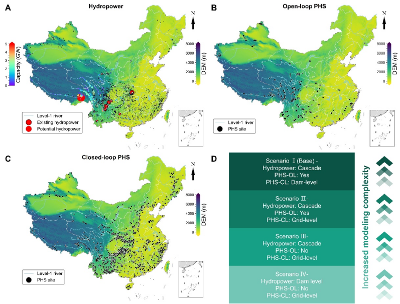 图1. 水电与抽水蓄能资源潜力及情景设计。(A-C: 水电及开环、闭环抽水蓄能装机经济潜力分布;D: 各情景建模设定)