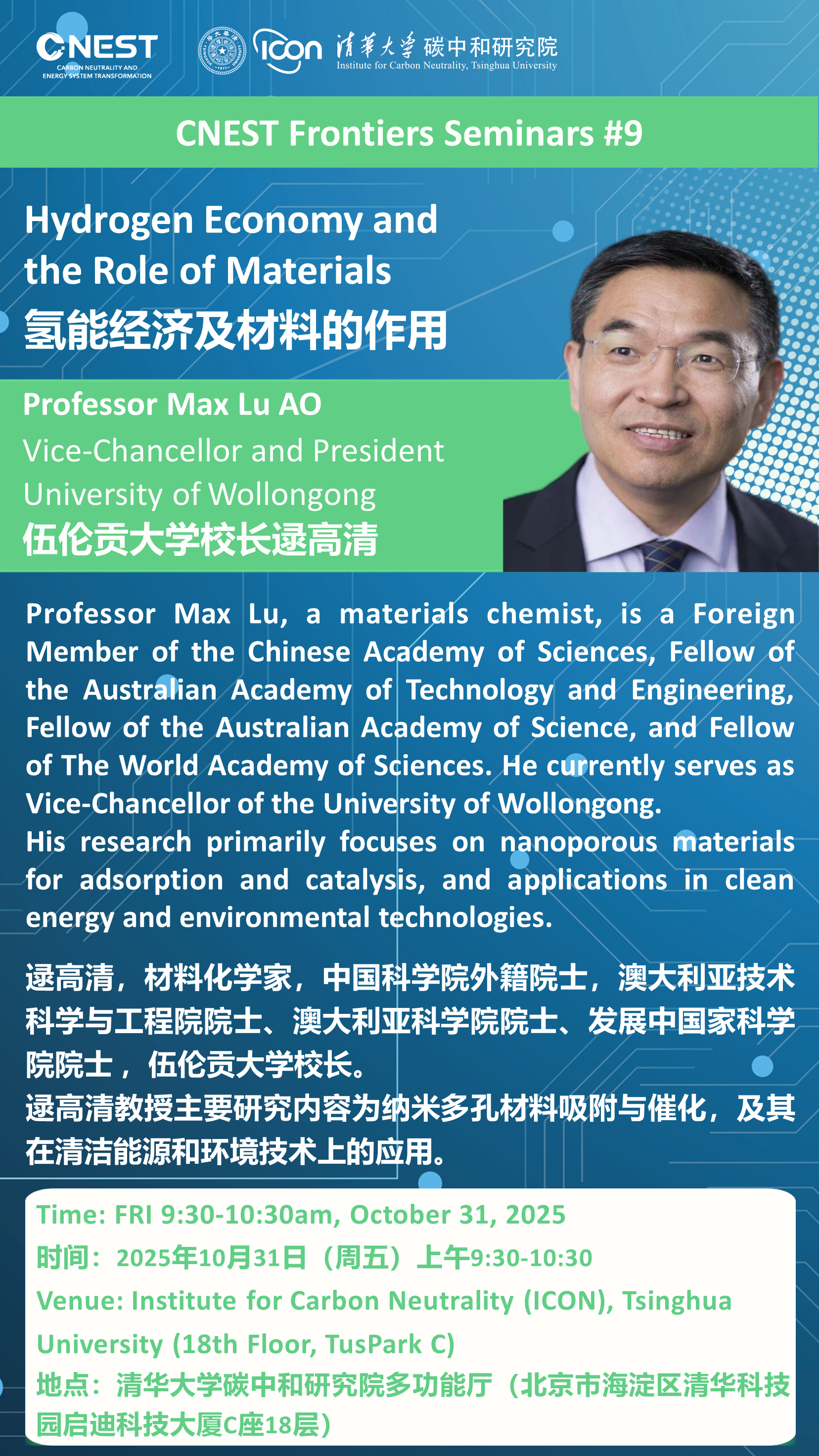 10月31日,碳中和与能源智联(CNEST)前沿讲座第9期将在清华大学碳中和研究院多功能厅举办。活动邀请中国科学院外籍院士、澳大利亚技术科学与工程院院士、澳大利亚科学院院士、发展中国家科学院院士 、伍伦贡大学校长逯高清教授就氢能经济及材料的作用进行主题演讲,并就相关话题进行交流讨论。CNEST前沿讲座是“碳中和系统科学与技术”一级学科博士研究生必修的碳中和技术前沿课程。欢迎报名参加!