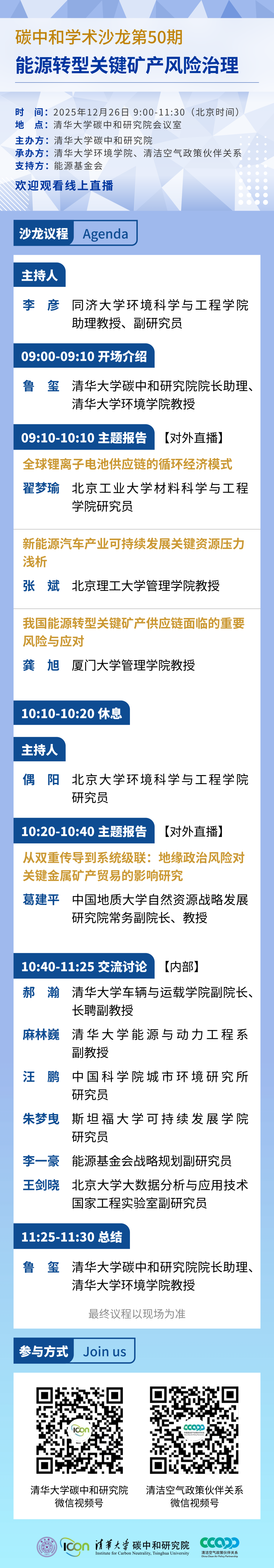 在“双碳”战略目标及全球应对气候变化大背景下,能源系统的绿色低碳转型已成为全球治理体系中的核心议题与关键路径。关键矿产作为能源转型技术不可或缺的物质基础与战略性资源,其供应链的稳定性、安全性及韧性,直接关系到全球能源转型的进程。兹定于2025年12月26日上午9:00举办碳中和学术沙龙第50期——能源转型关键矿产风险治理。聚焦全球关键矿产供需格局的演变趋势,关键矿产供应链风险防控,着力推动跨学科、跨产业的协同创新研究,以期为我国及全球能源绿色低碳转型提供坚实的科学支撑与策略参考。