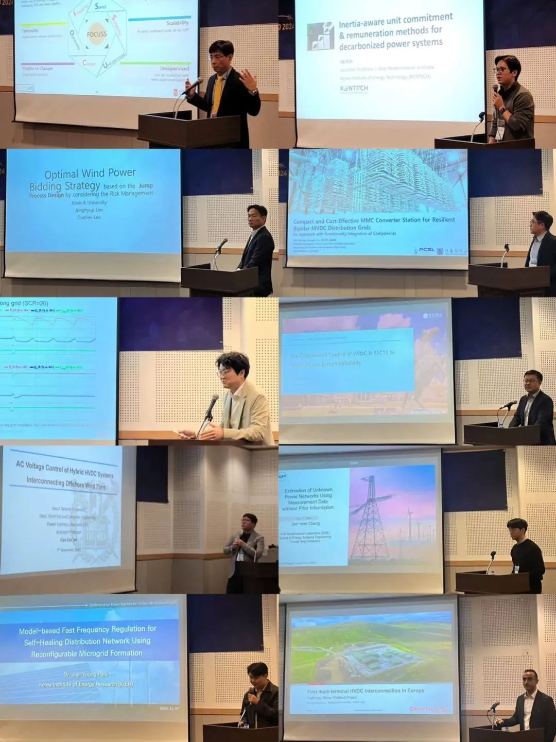此次会议深入探讨了中韩在碳中和目标下的极高比例可再生能源电力系统的规划与运行、保护与控制领域的最新研究成果。中韩双方在以“面向碳中和的电力系统优化与市场运行”“现代电力系统中的电力电子技术应用”“高比例IBR电力系统的控制与稳定”“配电网中的智能电网技术”“HVDC技术的应用实例”为主题的6个分论坛上进行了研讨交流。在研讨会中,中方由华北电力大学周明教授、清华大学郭鸿业助理研究员、华中科技大学曲荣海教授、北京大学王剑晓助理研究员、武汉大学博士研究生李晨、浙江大学包铭磊研究员、南瑞继保副总工程师詹长江博士、清华大学李笑倩副研究员、南网超高压公司刘航研究员依次作专题报告;韩方由西江大学Hongseok Kim教授、韩国能源工程科技大学Jip Kim助理教授、建国大学Duehee Lee副教授、首尔大学Shenghui Cui助理教授、庆北大学Jae-Jung Jung教授、光云大学Minhan Yoon副教授、首尔大学Gyu-Sub Lee助理教授、中央大学Jae-Won Chang助理教授、韩国能源技术研究院Jae-Young Park研究员、日立能源研发经理Arman Hassanpoor博士共10位专家学者在会上进行学术报告。会中另设有学生论文海报展,经参会人员的投票推荐,高丽大学博士研究生Minhyeok Chang、清华大学博士研究生蔡啸与上海交通大学博士后王梦圆获得最佳论文海报奖(Best Poster Paper Award)。
